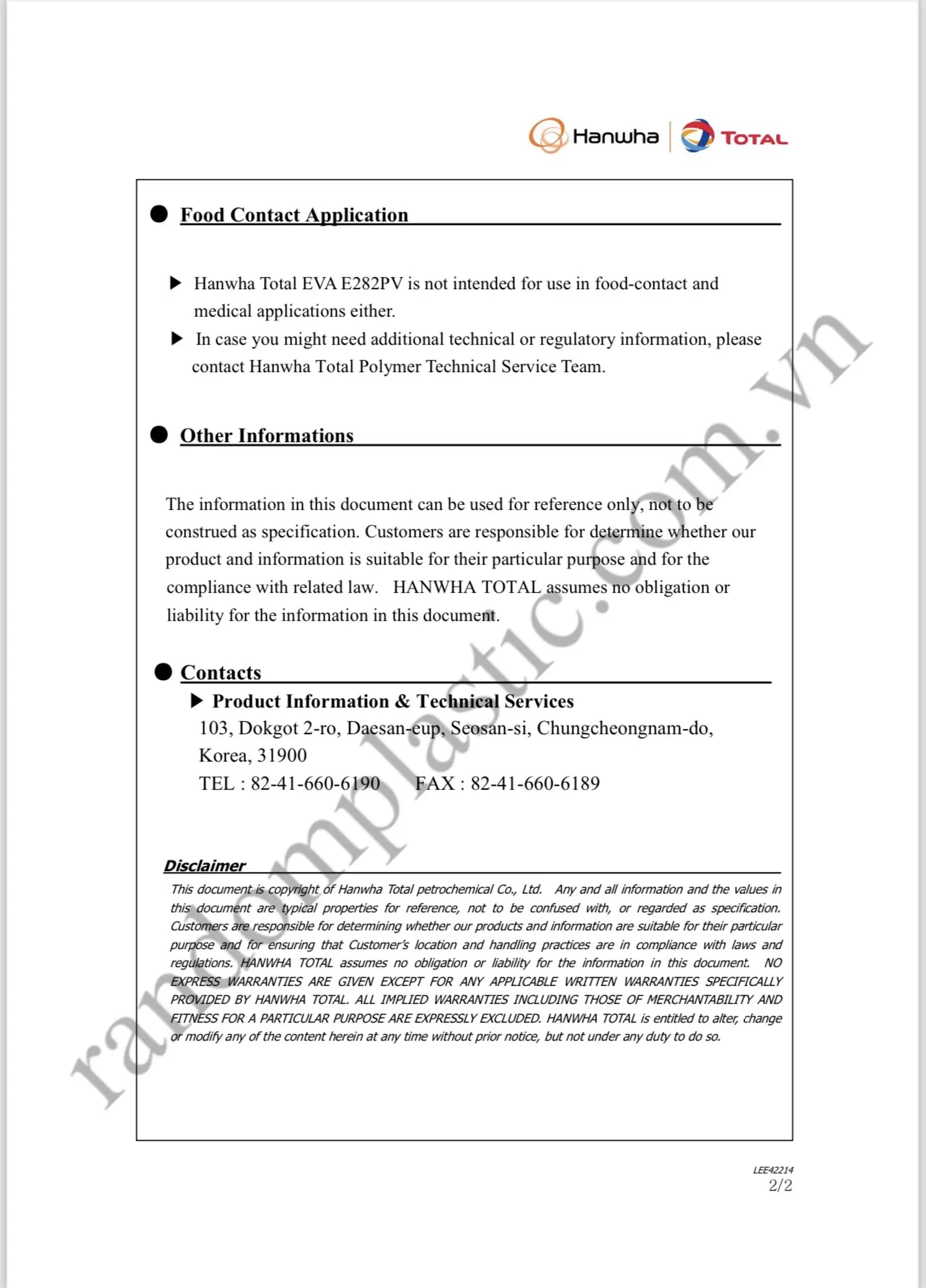 Bảng thông số tiêu chuẩn kĩ thuật Hạt nhựa EVA E282PV