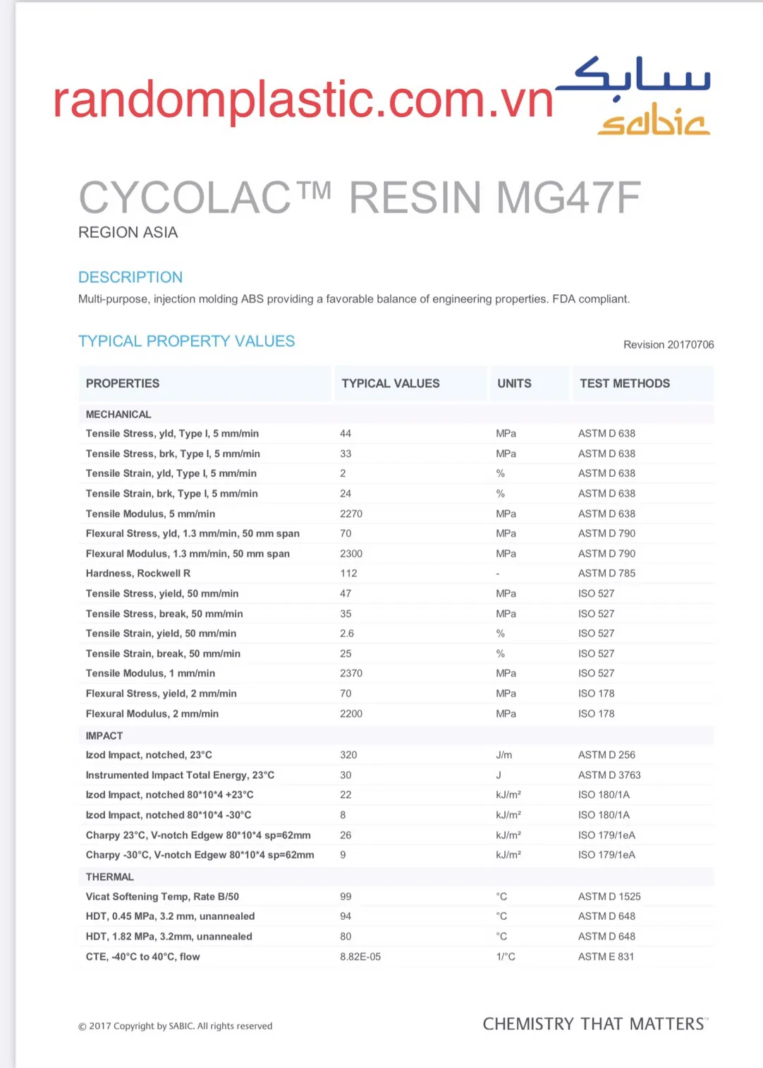 Hạt nhựa nguyên sinh ABS MG47F cứng, rắn, chịu va đập mạnh, nhưng không giòn, sửa dụng nhiều trong kĩ nghệ điện tử, điện, ôtô, xe máy