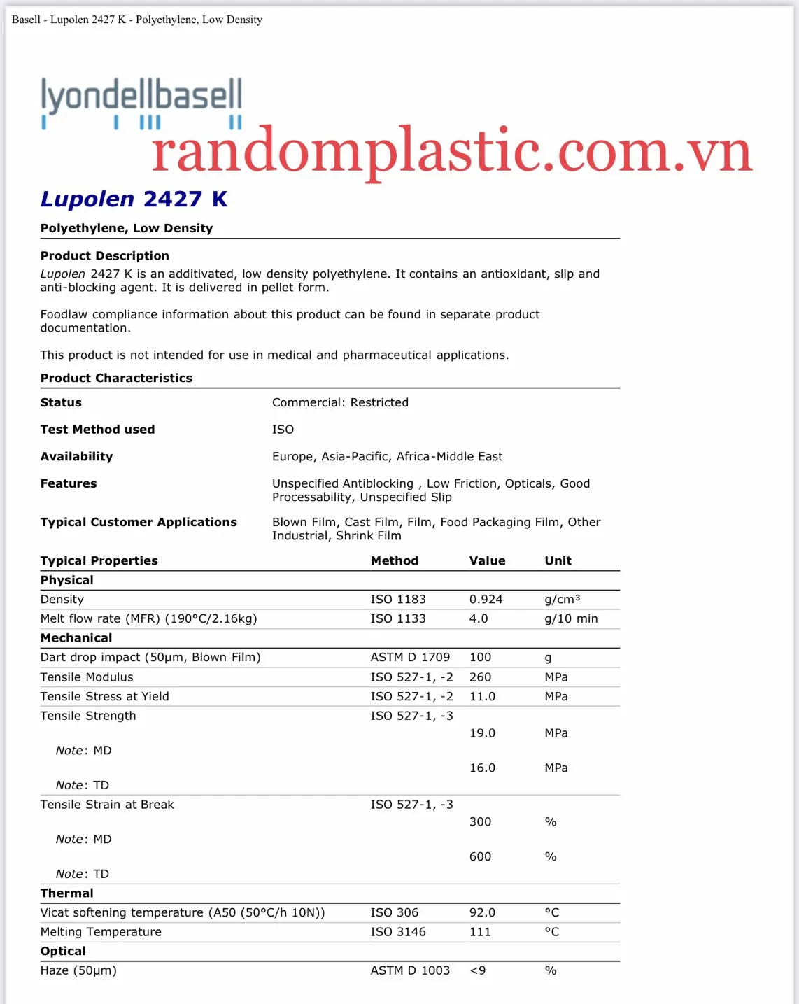 Mã hạt nhựa: LDPE 2427K - Basell, Ả rập Xê út