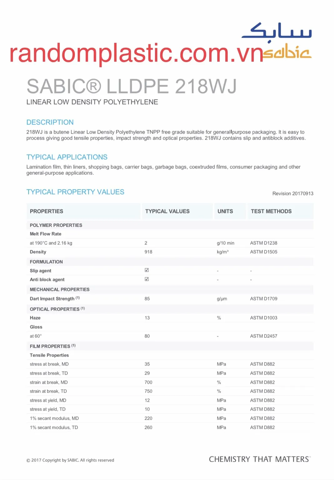 - Ứng dụng LLDPE 218WJ: Màng cán, lớp lót mỏng, túi đi chợ, túi xách, túi rác, màng ép đùn kết hợp, đóng gói tiêu dùng và các ứng dụng chung khác.