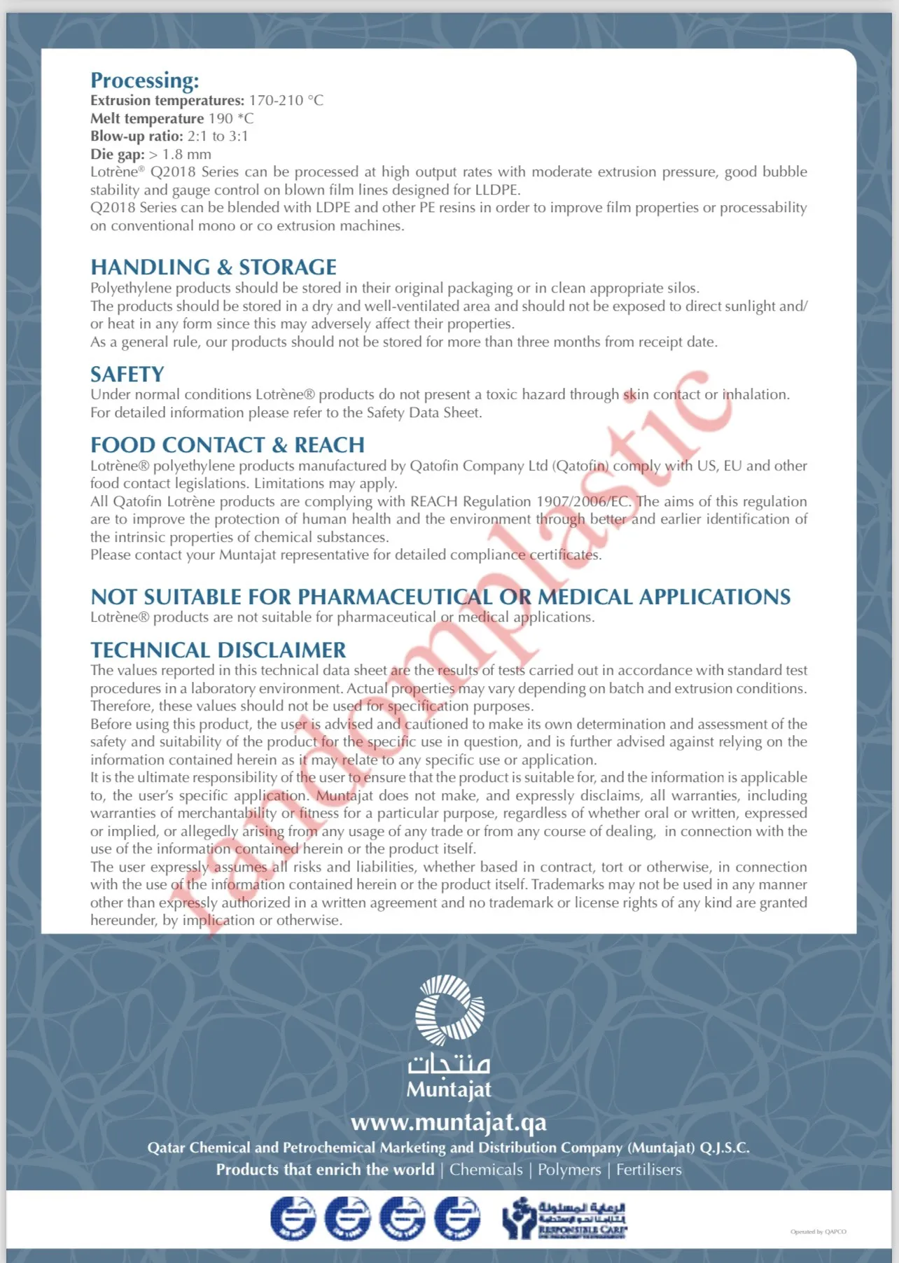 Hạt nhựa nguyên sinh LLDPE Q2018H là sản phẩm của hãng Nhà sản xuất: QATOFIN - QATAR. Được nhập khẩu và phân phối bởi Công ty TNHH Sản xuất và TM RANDOM