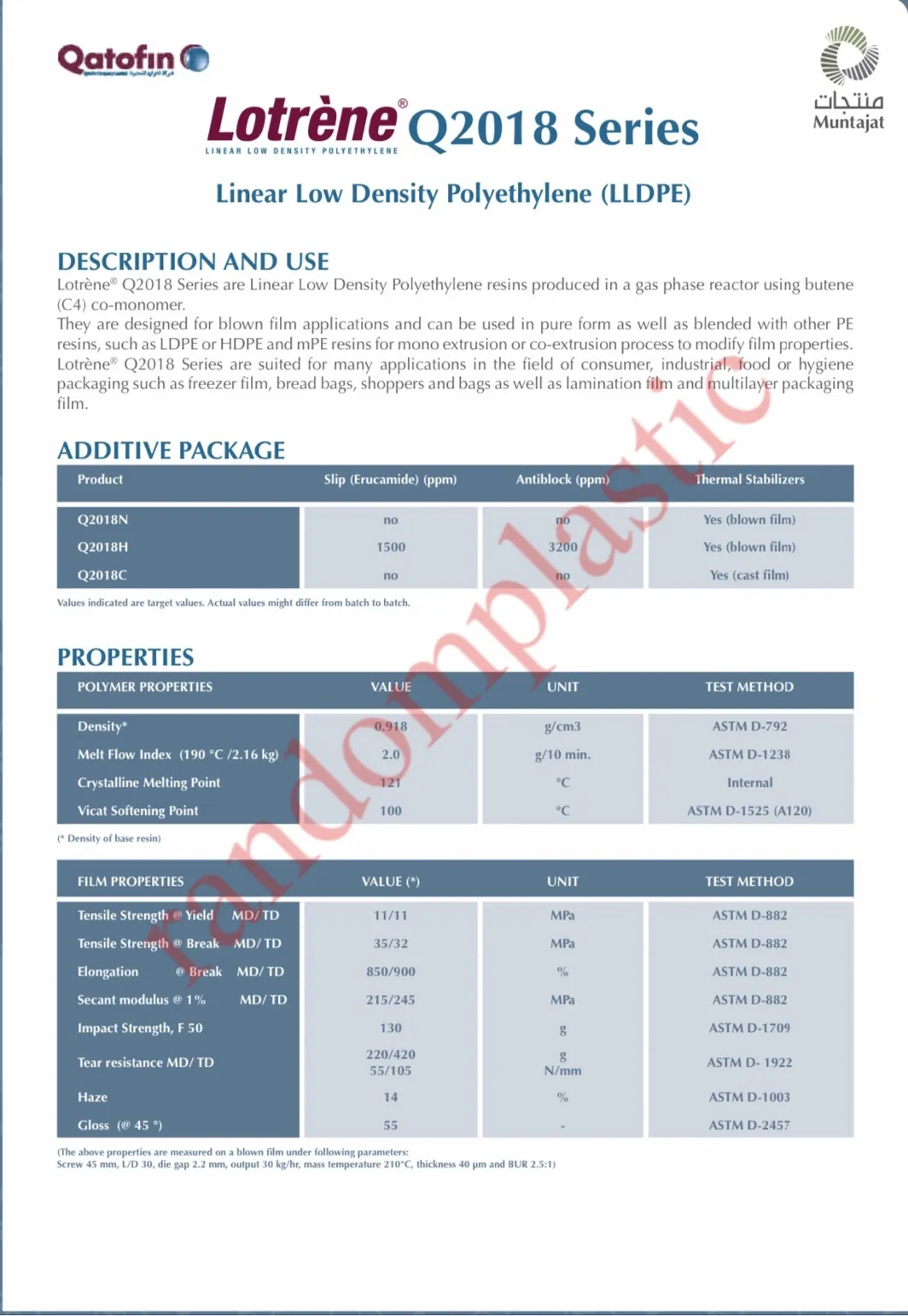 Hạt nhựa nguyên sinh LLDPE Q2018N là sản phẩm của hãng Nhà sản xuất: QATOFIN - QATAR. Được nhập khẩu và phân phối bởi Công ty TNHH Sản xuất và TM RANDOM