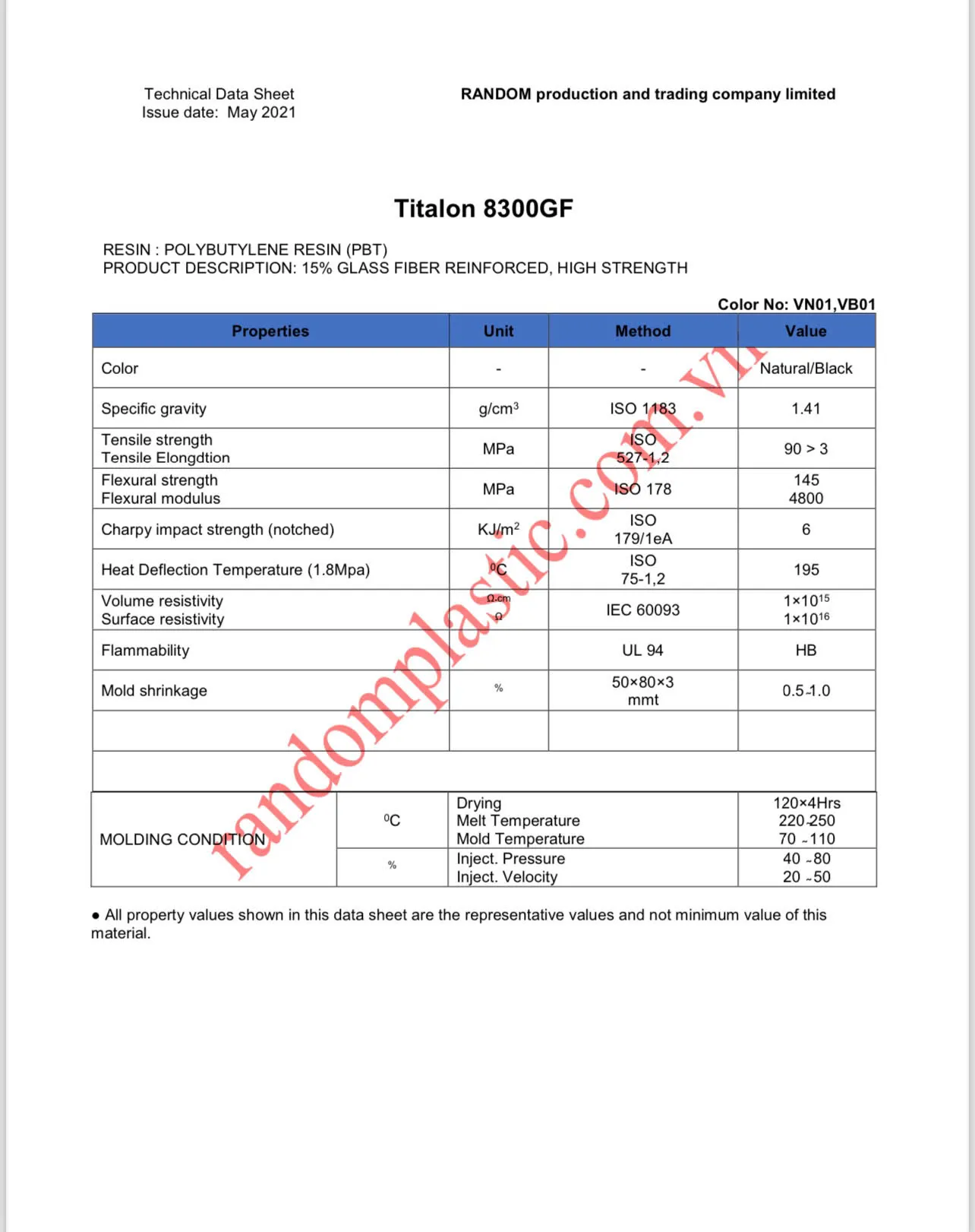 PBT 8300GF là hạt nhựa PBT 15% sợi thủy tinh chịu va đập và độ cứng cao, kháng được hóa chất, định hình tốt, chuyên sử dụng trong sản xuất các linh kiện kĩ thuật.