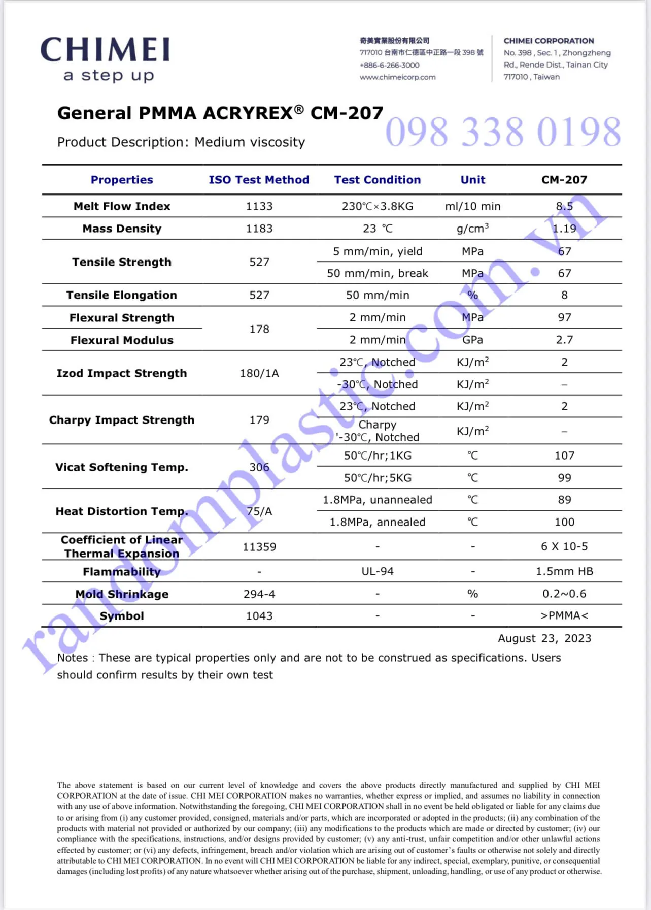 Bạn muốn mình giúp so sánh PMMA CM-207 với các dòng PMMA khác như CM-205 hay CM-211 không? (Để chọn phù hợp với nhu cầu sản xuất của bạn). Có thể liên hệ