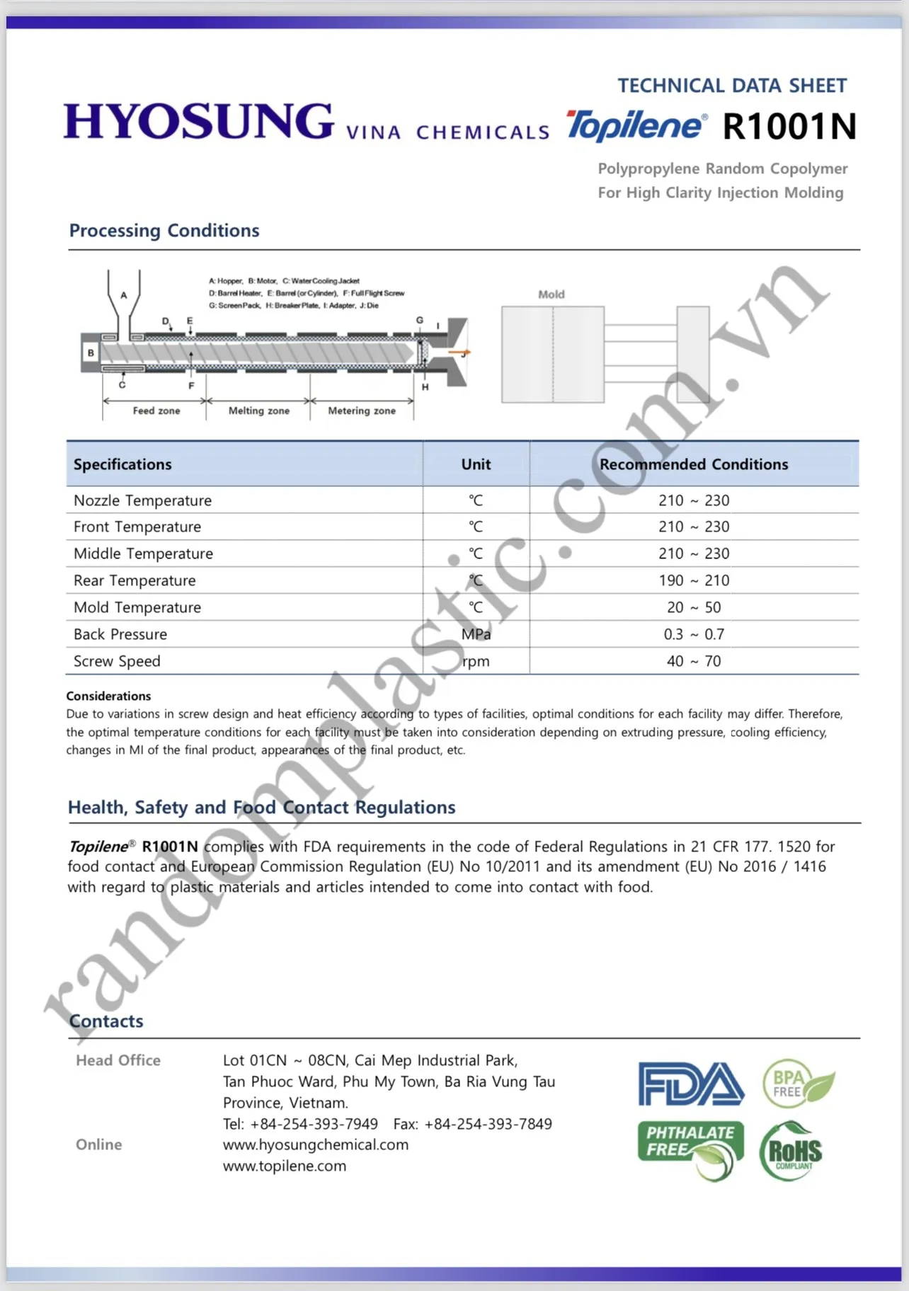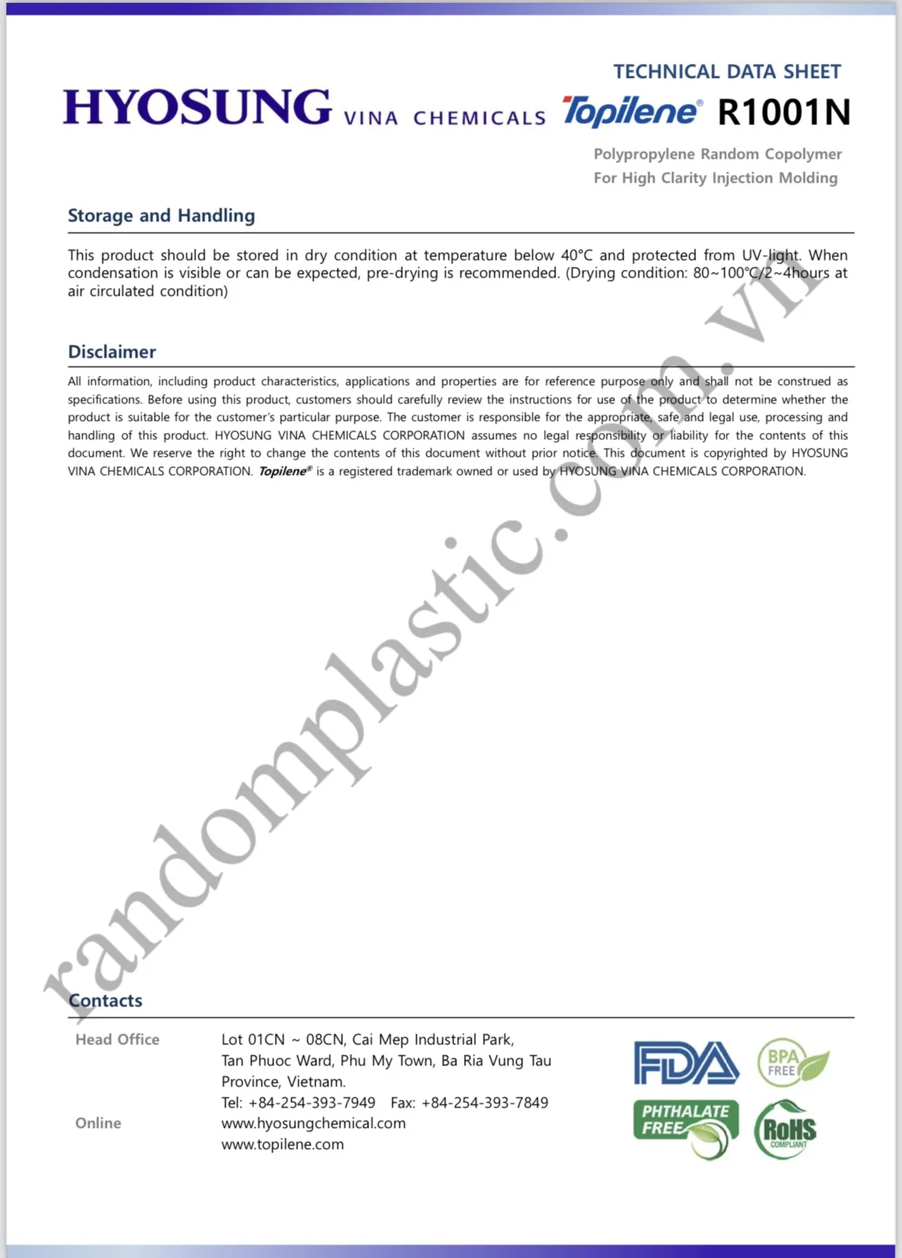 Hạt nhựa nguyên sinh PP R1001N dùng làm bao bì một lớp chứa đựng bảo quản thực phẩm, không yêu cầu chống oxy hóa một cách nghiêm nhặt.