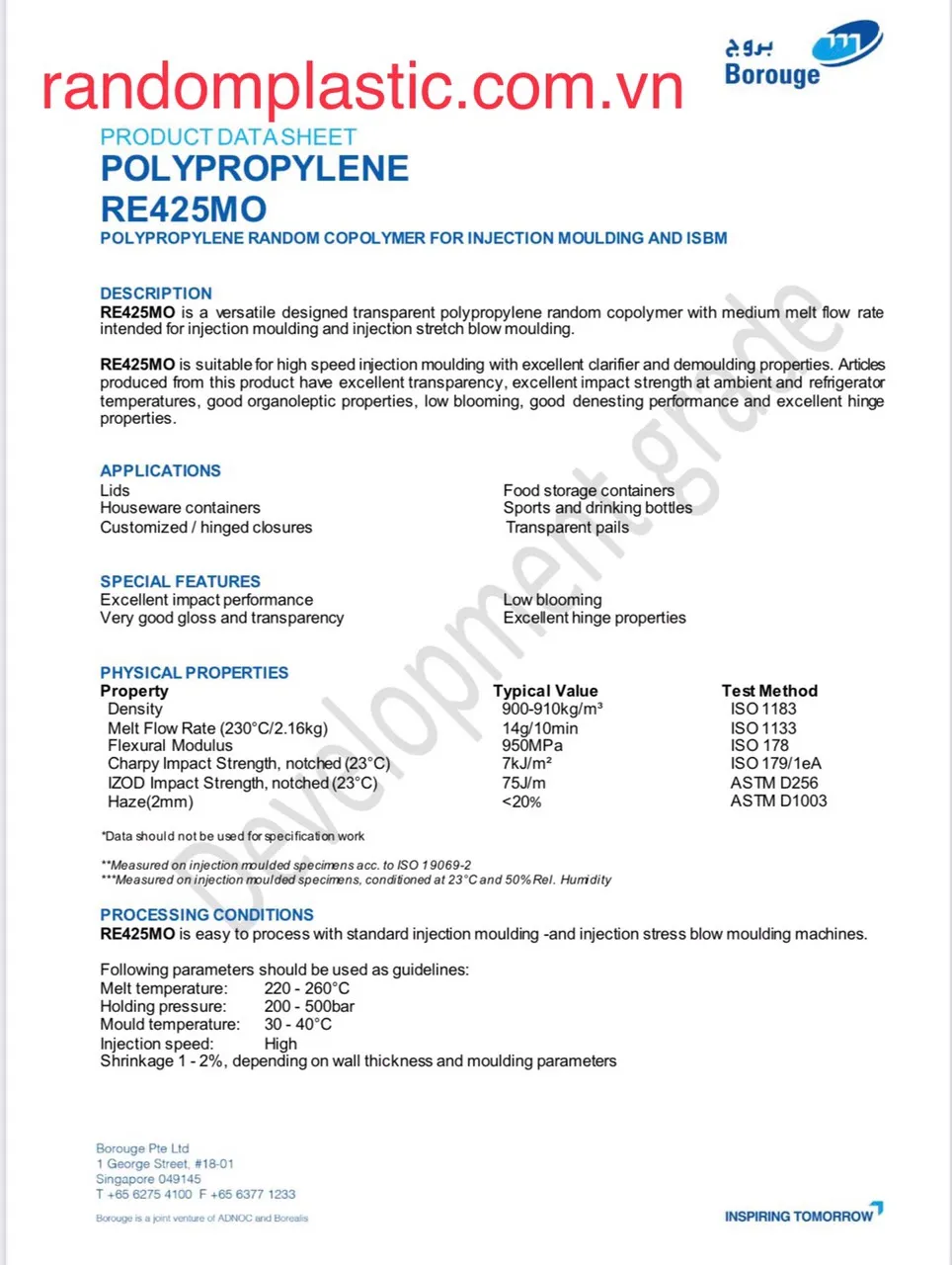 Thuộc tính của hạt nhựa nguyên sinh PP RE425MO