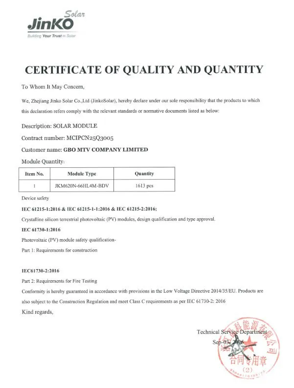 Tấm pin chất lượng luôn đi kèm bộ chứng từ đầy đủ gồm CO, CQ, chứng nhận IEC và hồ sơ thử nghiệm kiểm định. Đây không chỉ là giấy tờ mang tính pháp lý, mà còn là minh chứng cho việc tấm pin đã vượt qua hàng loạt bài kiểm tra khắc nghiệt về an toàn điện, độ bền cơ học, khả năng chịu nhiệt và độ ổn định khi vận hành ngoài trời.
